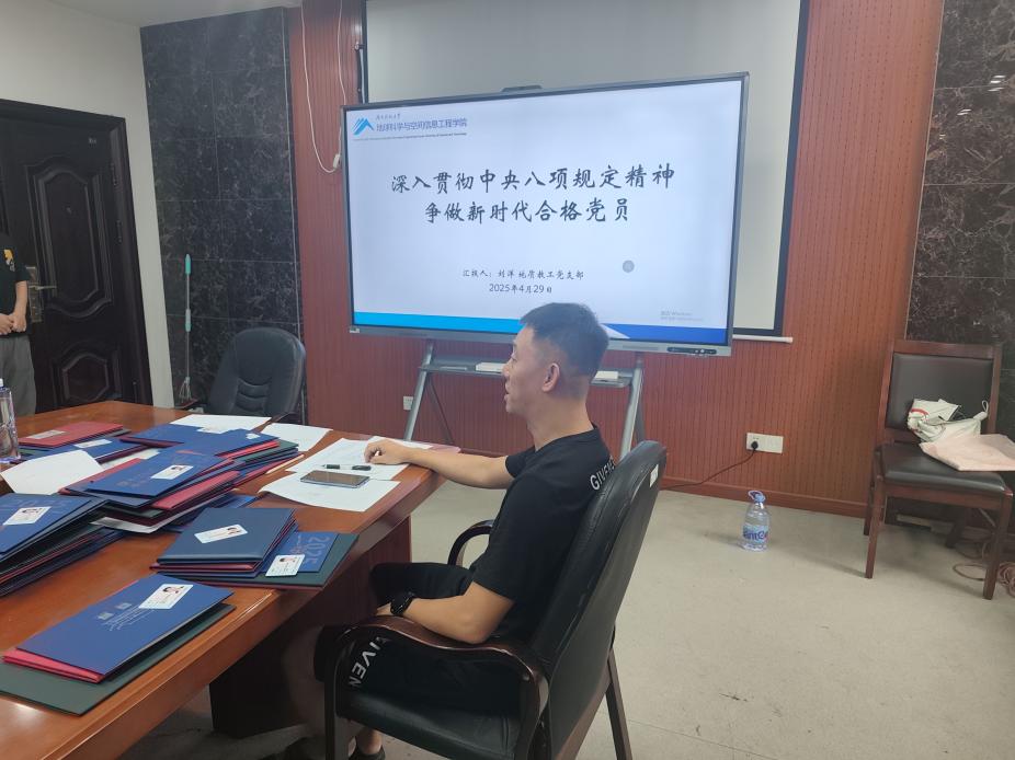 深入贯彻落实全面从严治党要求,强化党员作风建设,2025年4月29日下午,教工党支部书记刘洋同志在地学楼307会议室为支部全体党员讲授题为“严守八项规定精神,筑牢党员政治根基”的专题党课。