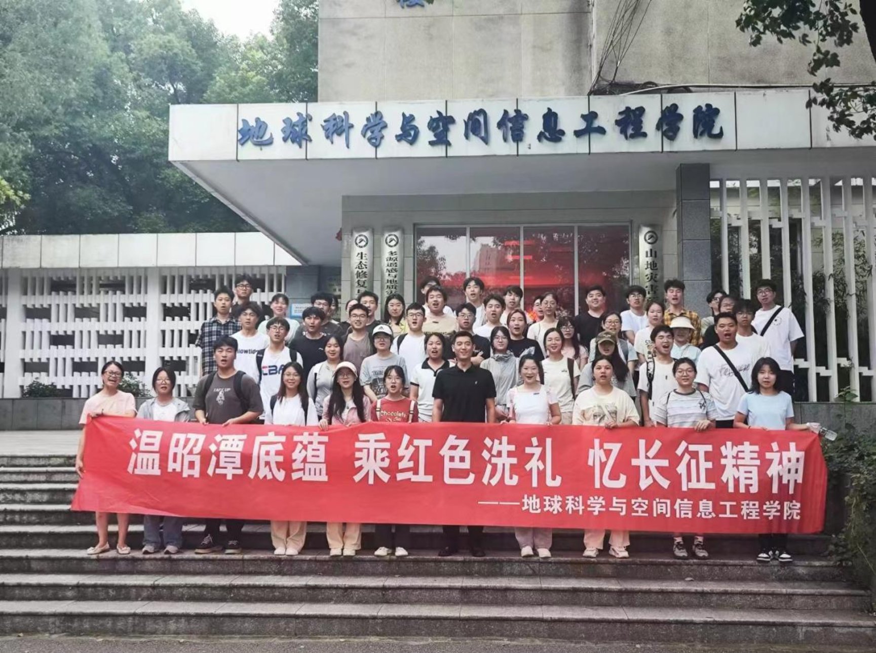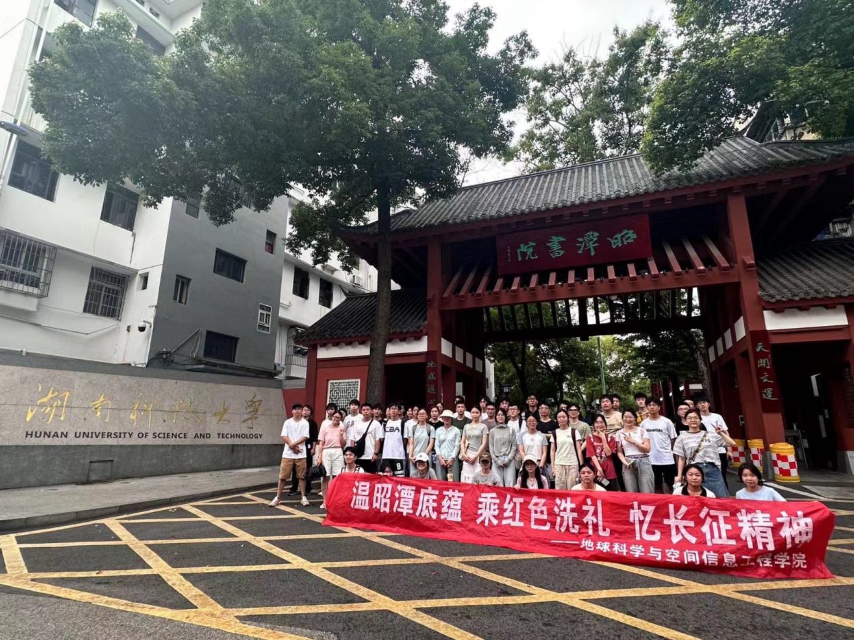 此次徒步路线全长约10公里,沿途风景优美,既有绿树成荫的小径,也有一望无边的湘江。同学们从学校南门出发,沿着湘江途径万楼,观湘门到达科大雨湖校区昭潭书院。虽伴有零星小雨,但同学们昂首挺胸,迈着坚定的步伐,在微风中显得格外精神抖擞,大家互相鼓励,互相帮助,共同面对路途中的挑战。组织员刘俊老师也不断和同学们讲述着革命的故事,激扬慷慨振奋人心。