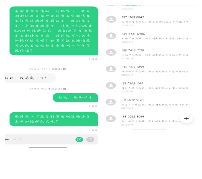 首先是对老校友们通过电话以及发短信的方式进行问候,之后向他们告知地人人足球直播 的成立并且进行邀请工作,除此之外我们还向各地校友会进行邀请,也接收了四川、云南等各地对地人人足球直播 成立的祝贺视频。