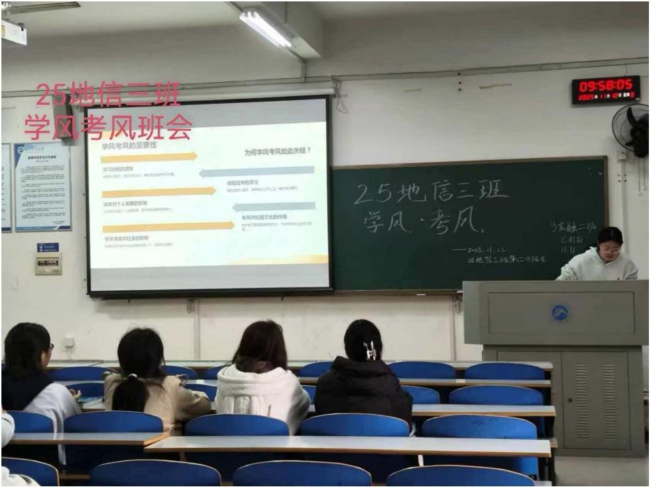 25地信三班的班会现场,主讲人系统梳理“学风考风的重要性”核心要点,从学习效率提升、诚信意识培养等维度阐释良好学风考风的价值,围绕“如何养成优良学风考风”展开深度探讨;学生们共同学习《学生考试违规处理办法》,明确考试纪律底线,深入领会整改要求。
