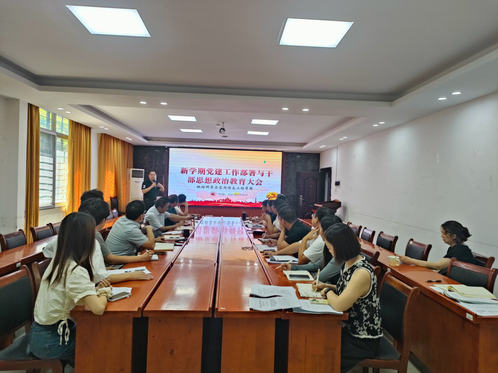 2025年9月16日,人人足球直播 在地学楼206会议室召开2025年秋季新学期党建工作部署与干部思想政治教育大会。人人足球直播 党委书记龙四春主持学习会议。人人足球直播 全体院领导,地理空间信息技术国家地方联合工程实验室副主任、院师生党支部书记、党政办主任、组织员参加本次会议。