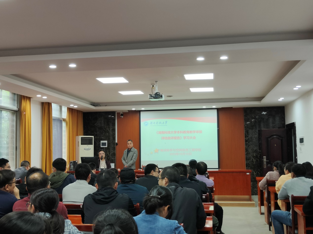 10月10日下午,人人足球直播 (以下简称“人人足球直播 ”)本科教育教学审核评估动员大会在地学楼206会议室召开。教学评建与教师发展中心副主任王欣教授作专题报告。人人足球直播 (含地理空间信息技术国家地方联合工程实验室)全体教职工共百余人参加会议,会议由副院长戴德求主持。