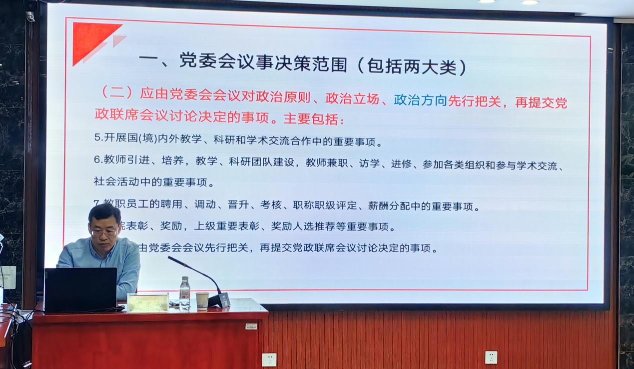 随后,党办校办尹风雨主任围绕“党委会、党政联席会会议决策范围以及教人人足球直播 会议议事规则中存在的问题”等方面详细的为学员们进行了系统培训与解读。他表示,在党委会和党政联席会决策过程中,要坚持党的领导,确保决策符合党的路线方针政策和工作要求。在决策过程中,要充分听取群众与班子成员的意见,党政一把手要充分沟通,民主集中,确保一心为公、公平公正。