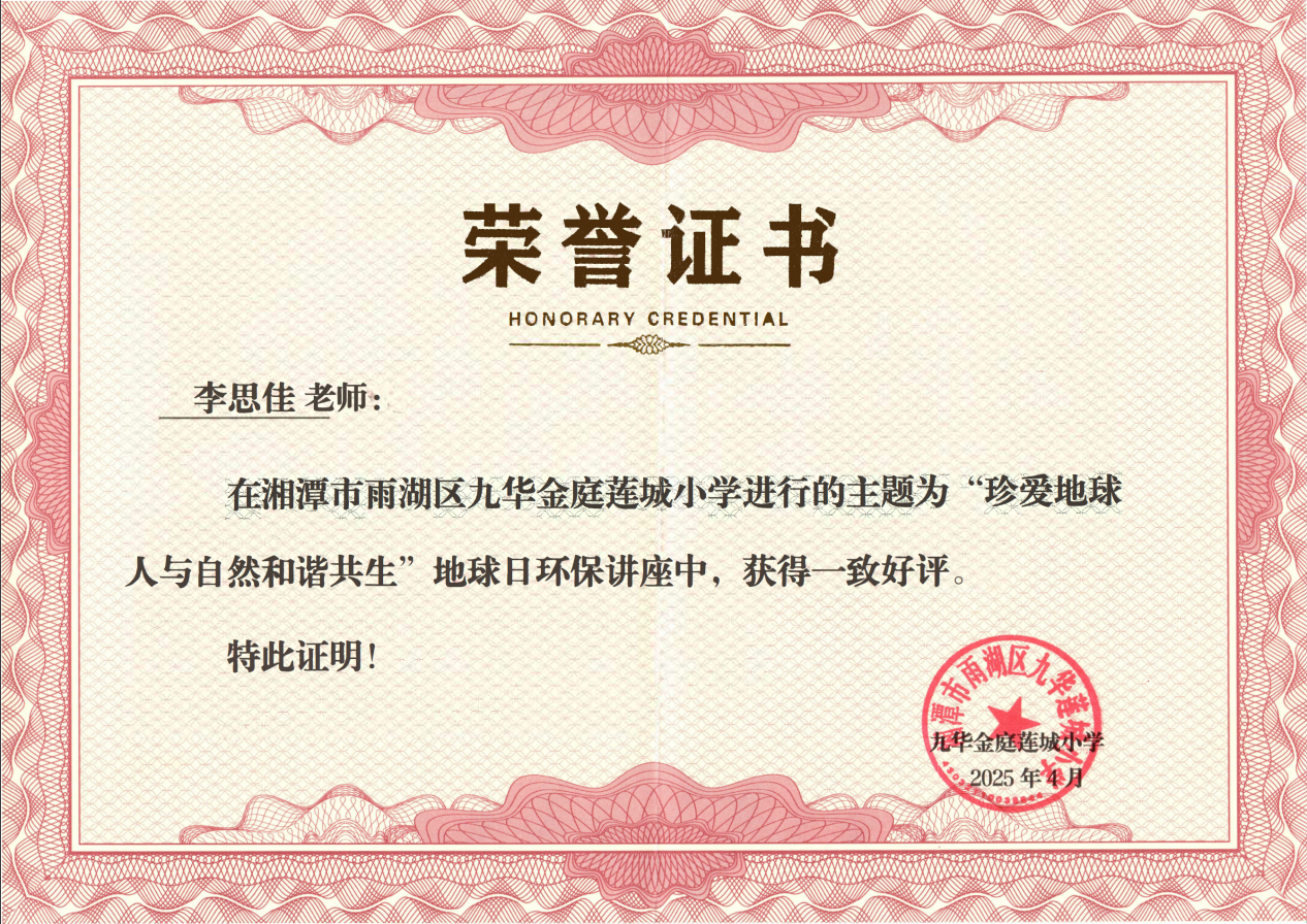 活动结束后,九华金庭莲城小学党支部向李思佳博士颁发了荣誉证书,表彰其在科普教育中的突出贡献。校方表示,此次活动是党建引领科普教育的一次成功实践,未来将进一步加强与高校党组织的合作,推动更多科技知识进校园,培养青少年的科学素养和环保意识。