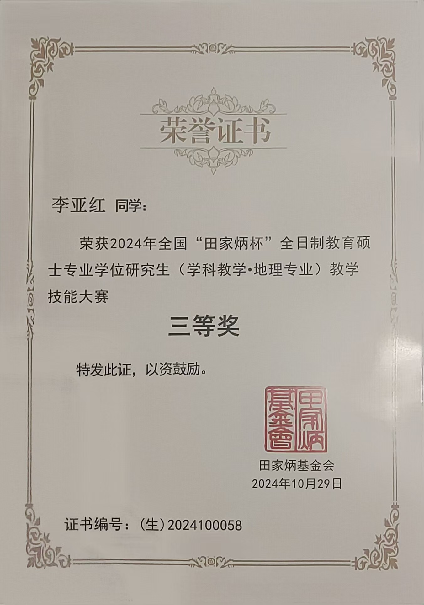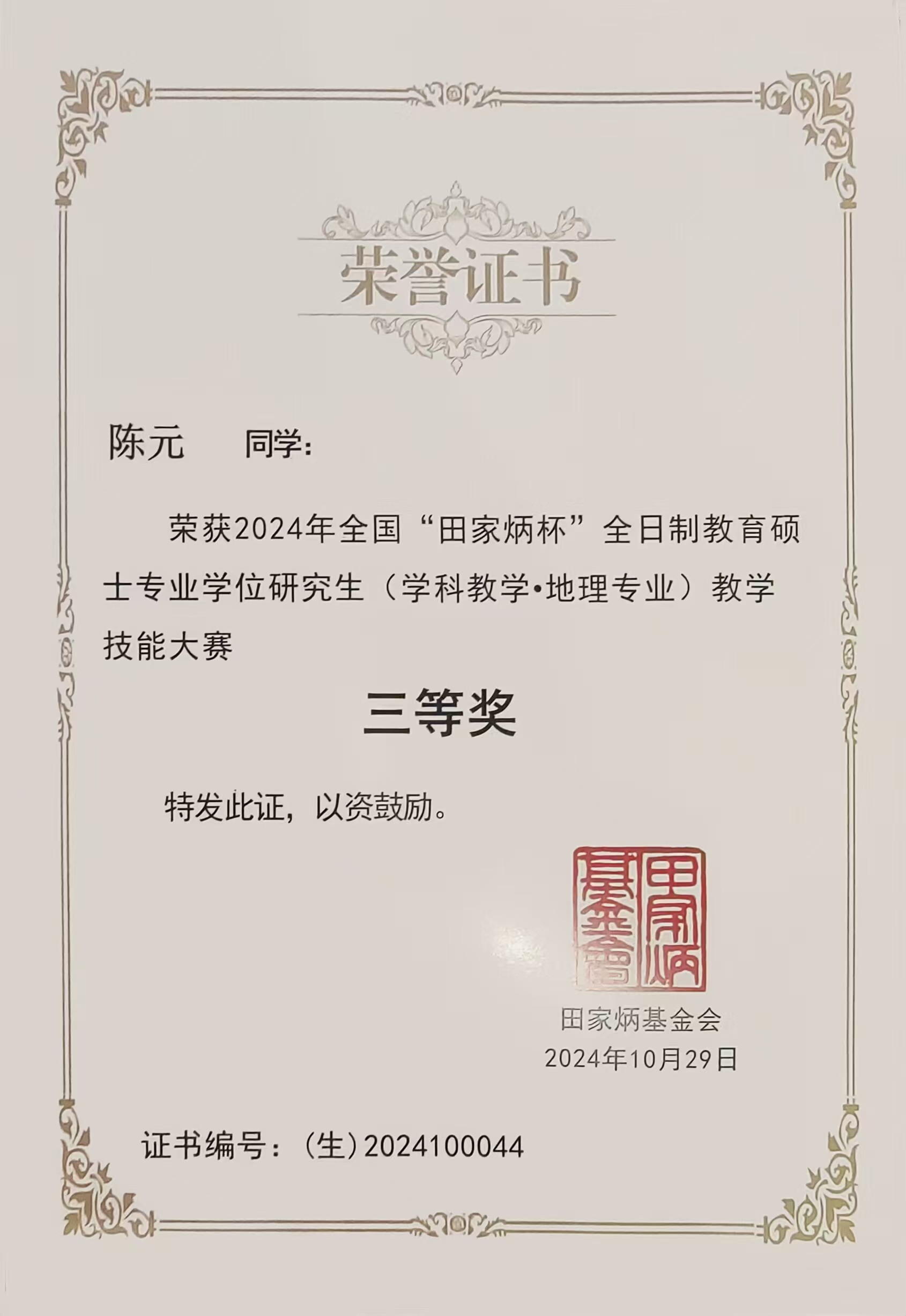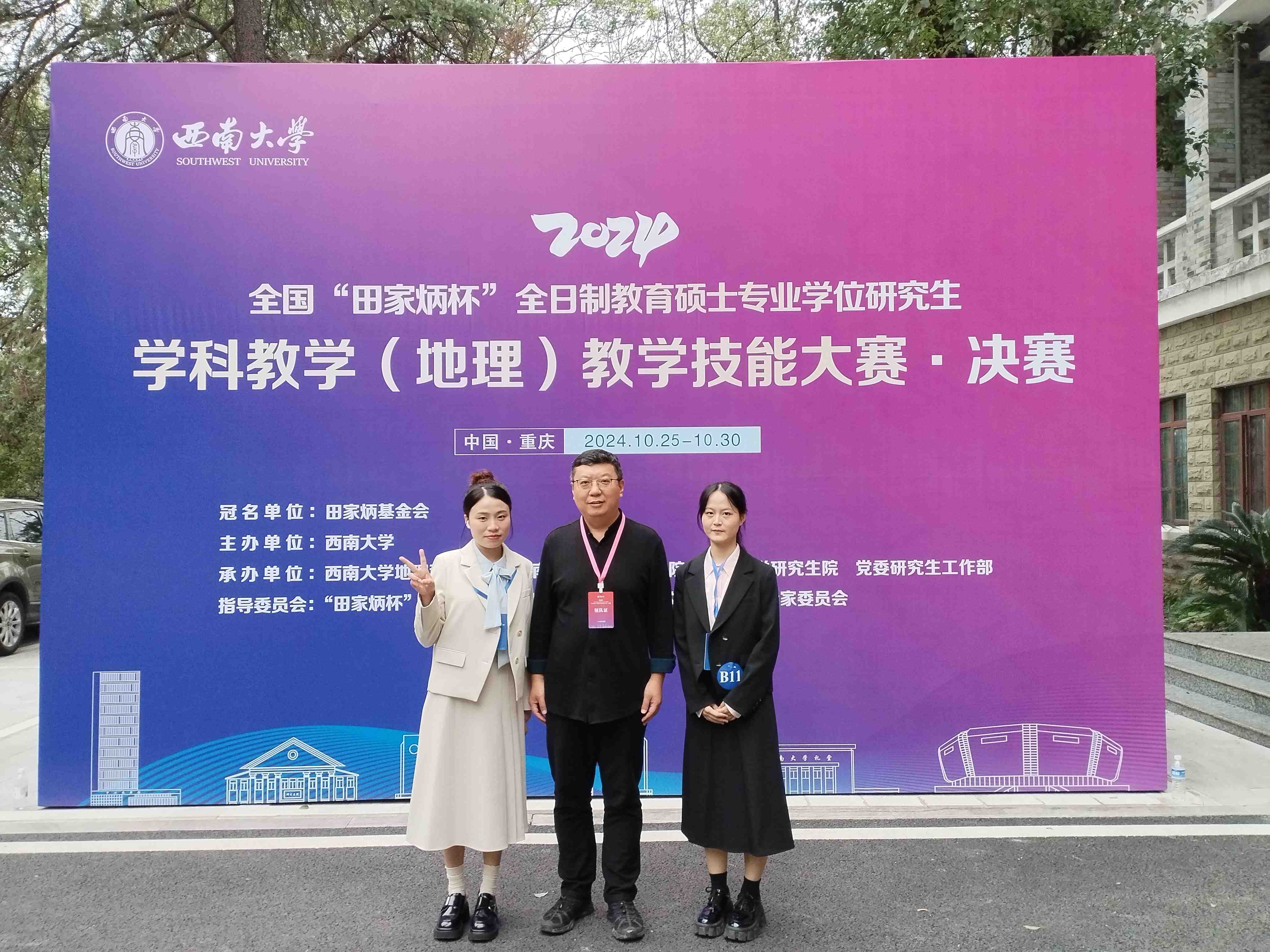 2024年10月26日-10月30日,2024年全国“田家炳杯”全日制教育硕士专业学位研究生学科教学(地理)专业教学技能大赛在重庆市西南大学落下帷幕,经过层层选拔和激烈角逐,我校2023级学科教学(地理)专业研究生陈元和李亚红均获三等奖。