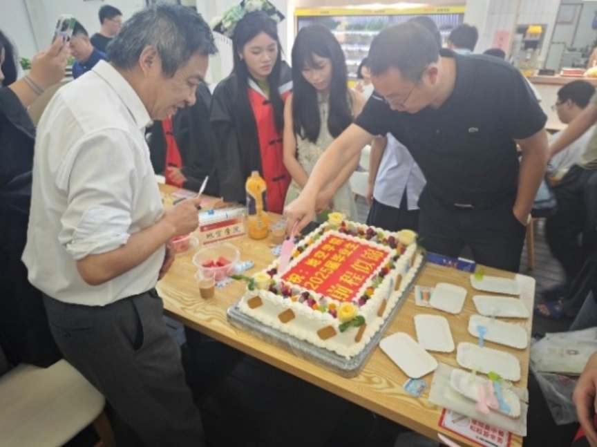 活动现场,人人足球直播 党委书记龙四春与毕业生代表共同切开写有“前程似锦”的毕业蛋糕。师生们一同分享这份甜蜜,现场气氛温馨热烈,欢声笑语中满是对毕业生的祝福与期许。