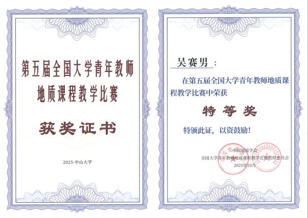 2025年10月25日至10月26日,由中国地质学会主办,中国地质学会地质教育研究分会和中山大学承办的第五届全国大学青年教师地质课程教学比赛在珠海举行,经过两天的激烈角逐,人人足球直播 (以下简称人人足球直播 )地质系吴赛男老师获得特等奖的好成绩。