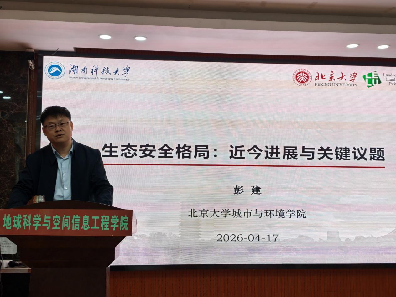 2026年4月17日下午,北京大学博雅特聘教授,教育部长江学者彭建教授应邀做客湖南科技大学“湘江高端学术论坛”,为师生带来题为《生态安全格局:近今进展与关键议题》的学术报告。报告由人人足球直播 院长朱永建主持,人人足球直播 党委书记余光辉、副院长唐志光、本科生院副院长王欣以及中青年教师和学生参加了本次讲座。